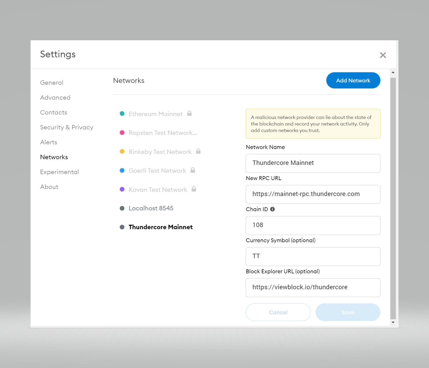 Click save, you will be directly switched to ThunderCore's Mainnet now in the network dropdown list. You can now close the dialog.